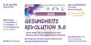 18.4.2026 – Gesundheitsrevolution die Gesundheitsmesse By Konstantin Chatziathanassiou Posted 25. März 2026 In Allgemein, Veranstaltungen 0 Gesundheitsrevolution 3.0 Infos unter: www.gsundheitsrevolution.at Recent Posts14.-24.7.2026 – Götter, Helden, Schattenwelten30.6.-10.7.2026 – Art in Re-/Upcycling22.-26.7.2026 – Wissenschaft und Kunst8.-19.6.2026 – Traumwelten